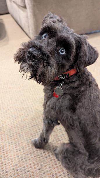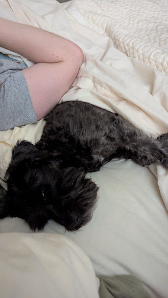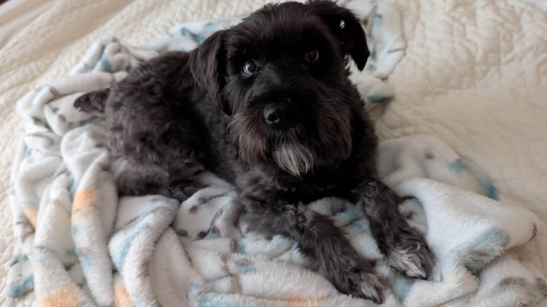 Our barky Schnauzer continues living the good life of sleeping in a human bed. No more crate for him, he just won't allow it.