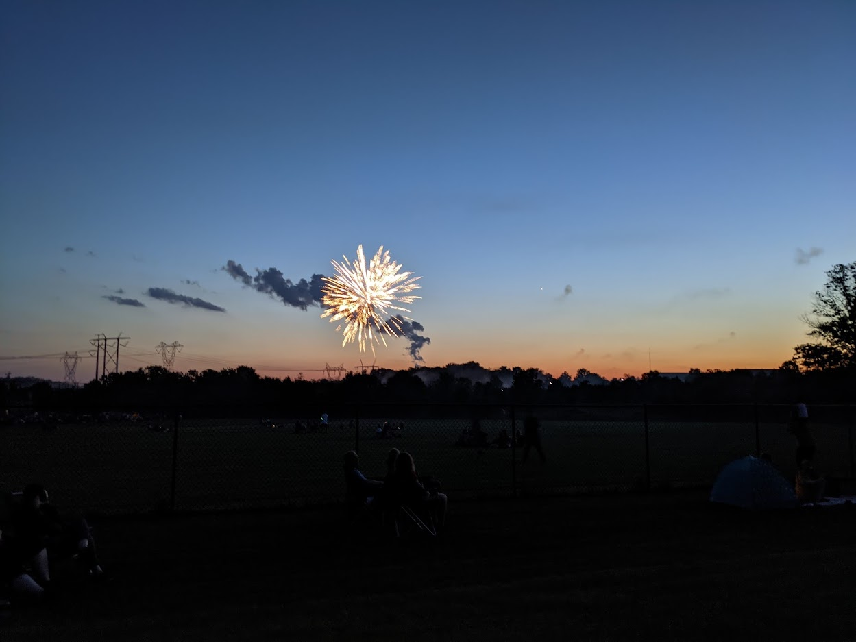 But the fireworks we came for couldn't be mistaken for the independent partiers that couldn't wait for full darkness to arrive. They announced themselves when a half-dozen whistling rockets exploded directly overhead. Then a half-dozen more, bombarding us from above, shockwaves rippling through my guts. When the opening salvo concluded, a roar of cheers went up. The collective effervescence was thick as blood. I've always liked fireworks, but to finally feel free of more than a year of lockdown avoiding the plague, on Independence Day no less, these fireworks brought tears to my eyes. I loved it.