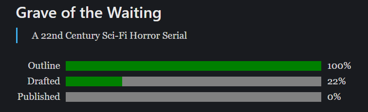 I've updated the progress bar for the first draft to 22% on the Projects page. However, I'm going to need to put this story on pause for a brief time because...
