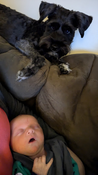 For the first half hour, he was barking constantly. Not aggressive, just scared of the new creature occupying our home. With some positive reinforcement (i.e. showering him with treats anytime he's calm around the baby), we managed to calm him down. Now he just flips out whenever Benny starts crying. It's a start.