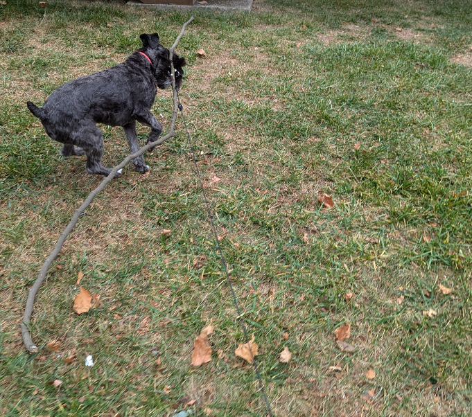 Before we dropped him off at grandpa's and left for the hospital, he was enjoying things discovered below the carpet of autumnal leaves before the landscapers blew them away. Such as a very large stick. Only 3 times his body length. Very manageable.
