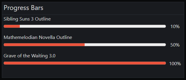 I've got the progress bar set to (BING!) 10%. There's much more written than that number implies. Across several documents – the worldbuilding bible, the official outline, brainstorming notes – I got about 18,000 words down this month. It's just that only a few sections are finalized, and those are what contribute to the 10%. For a full breakdown of how I calculate it, see the Trello board's Outline Progress card.
