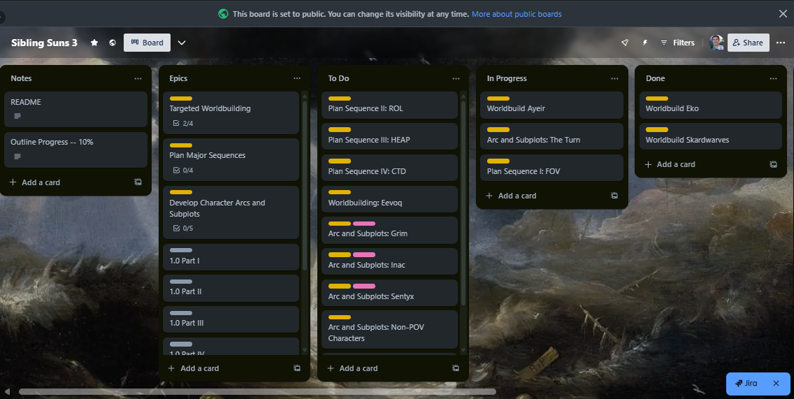 Last month, I promised to make more substantial progress on the Sibling Suns 3 outline. Et voilà! Just like To Burn All Belief, I made a public Trello board so you can follow along with my progress! I have never been accused of being a pantser, and things like this are probably why. I can't just outline a book. First, I must outline the outline.