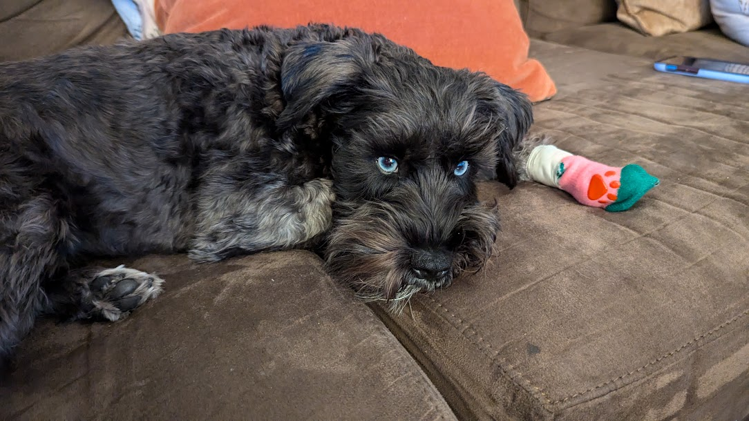 He hurt his paw and had to wear a sock. He hated it, but he's all better now.