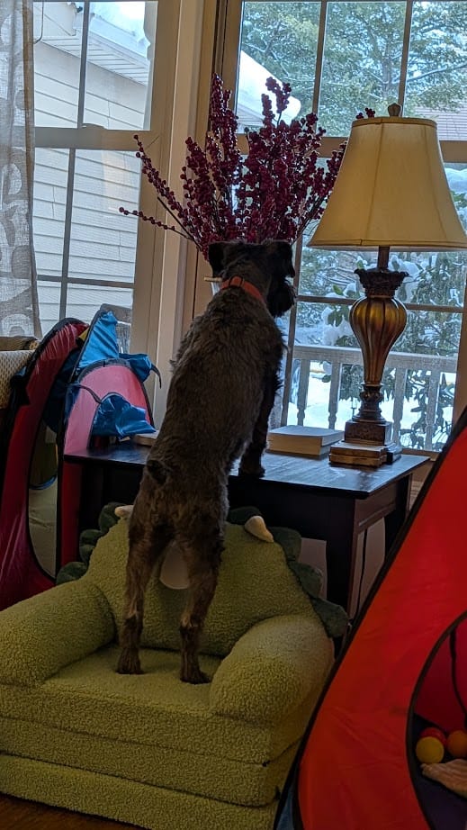 Our Christmas tree was blocking his normal vantage point of the window, so he used it to keep an eye out during a snowstorm. You know, for all the people strolling around in the blizzard...