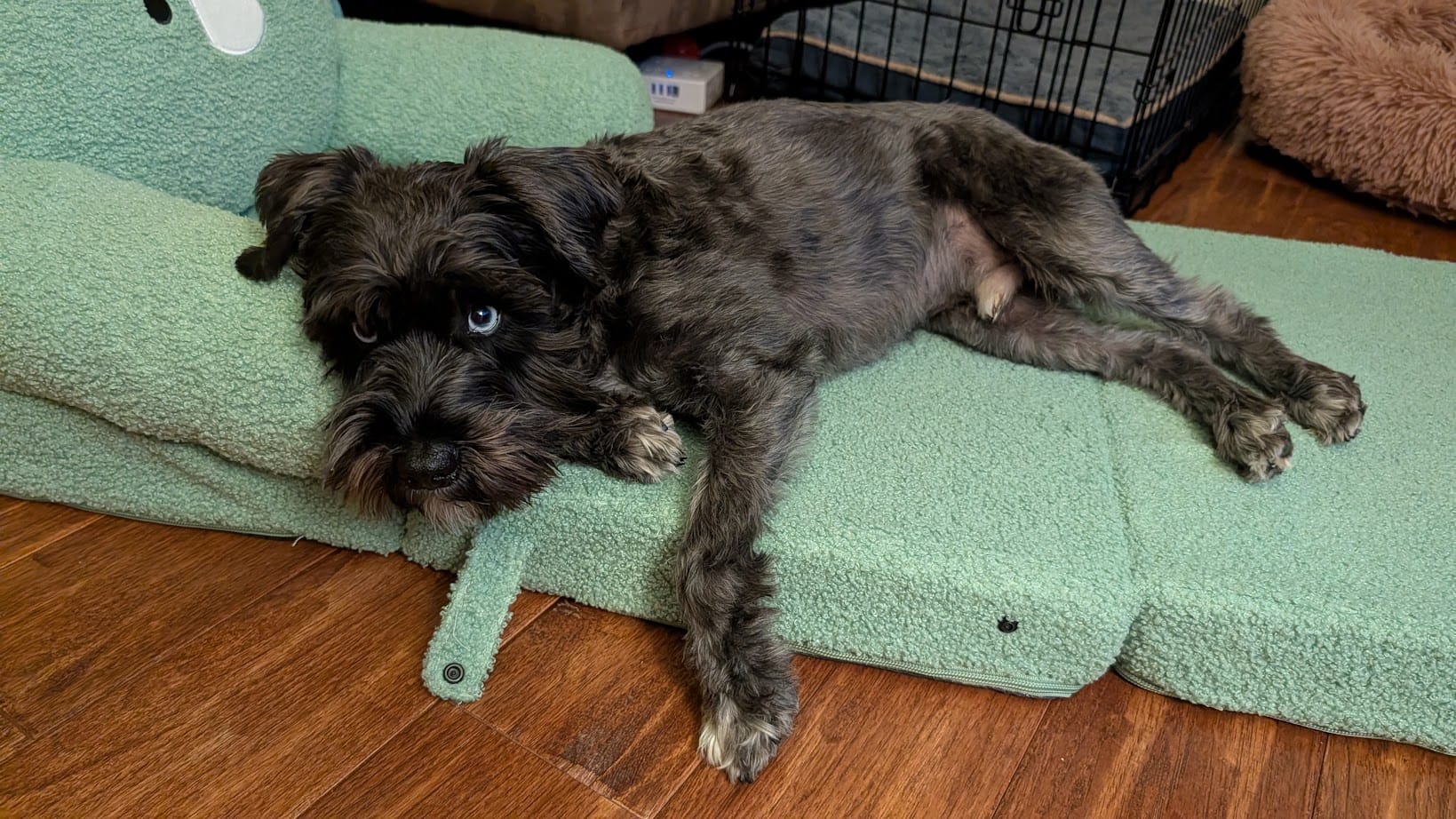 After the security sweep, he dried off (read: flung snow all over my basement) and settled down for some well-deserved rest on his new furniture.