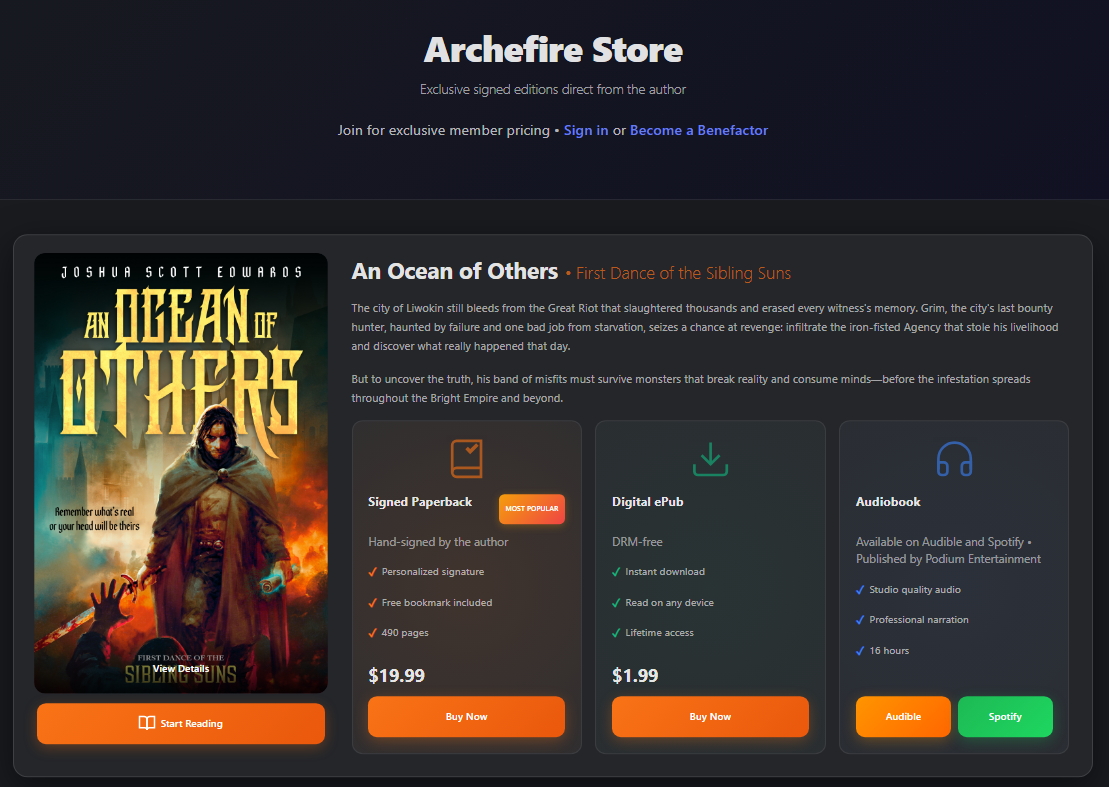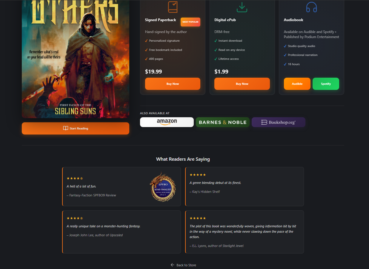 Another new feature is individual store pages for each book. There you can see some testimonials as well as other retailers that carry the book. Really, this is just laying the groundwork for when I start buying ads for my books on Meta and Google (and wherever else might work). I told you in this year's Odyssey of JoshSE, marketing is a weak spot of mine, and the goal is to improve at it before the release of Sibling Suns 3. Hence...