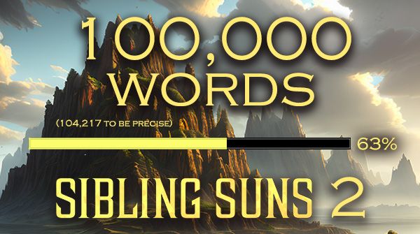 I hit another big milestone with Sibling Suns 2 this month: 100,000 words! If you were here last month, you might remember I sent a similar graphic that said 90,000 words and 50% progress. I reevaluated my outline, updated my progress board, and recalculated the numbers, so this is the more accurate than my last estimate. That's good, because I don't want this to be a 180,000 word book! Thinking about it though...I don't want this to be a 160,000 word book either. Plenty of trimming still to come in the second draft!