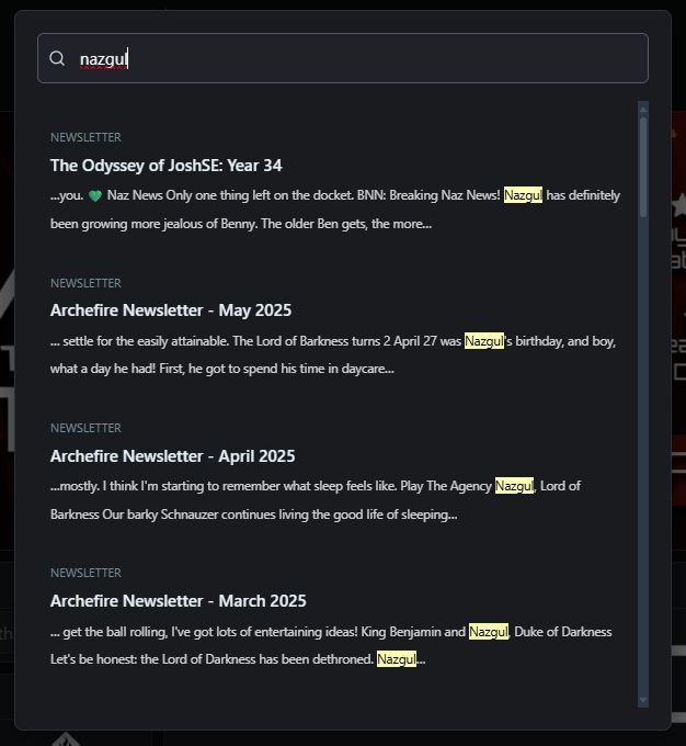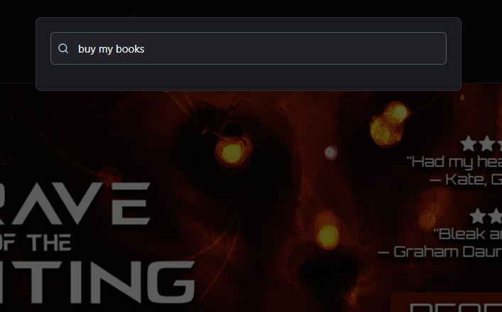 Instead of deleting two small sections of code to remove the limited time offer, I added 800 new lines across 13 files to add a sitewide search feature to the ever-shrinking rectangles of my homepage. Now you can, for example, search all my posts to fact check the last section about me never promoting my books.