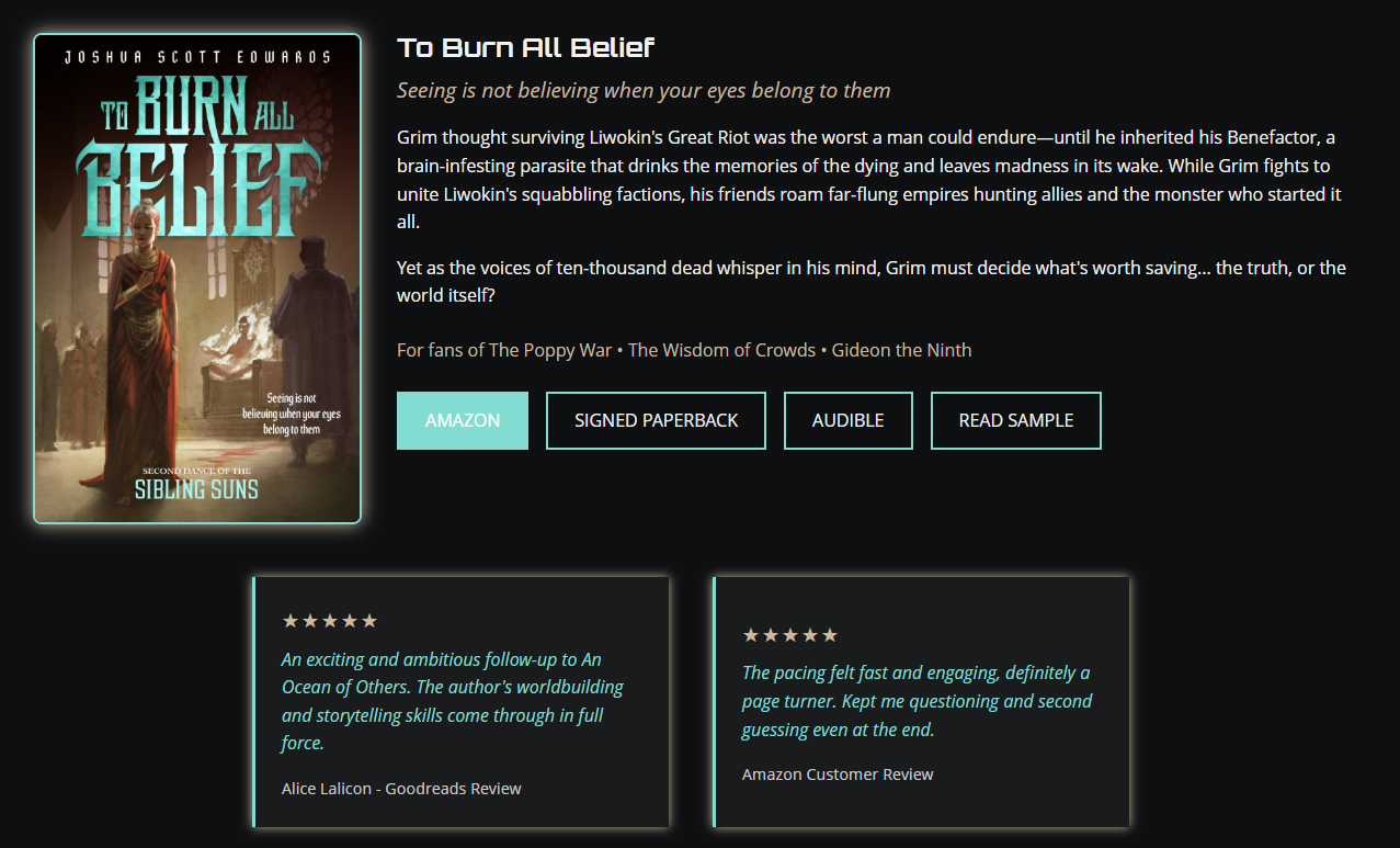In the meantime, due to unforeseen amounts of laziness and forgetfulness, I've left up the free download for To Burn All Belief at the Sibling Suns page. The page currently also says An Ocean of Others is free on Amazon, and that part is a filthy lie. So, I've got to fix the page soon—likely this weekend. Consider this your PSA to go grab a free copy while you can still take advantage of my error!