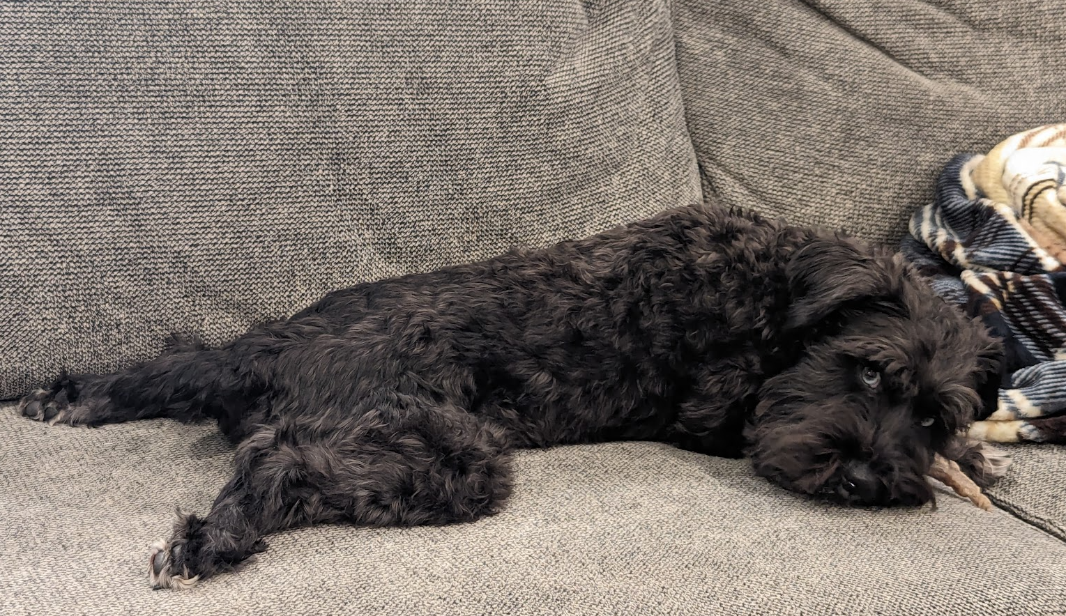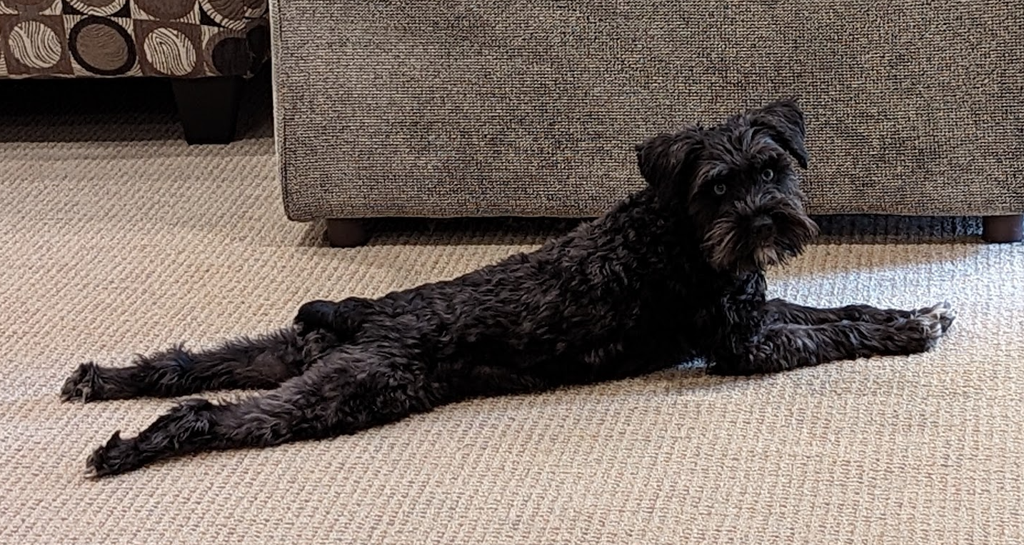 Then when it gets too hot (black fur heats up quick!) he comes inside to stretch his legs and look as cute as ever.