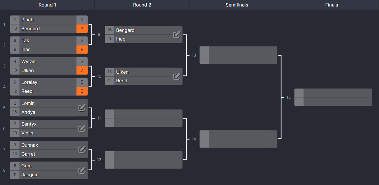 In round one, Bengard slayed a Benefactor and came out on top. Inac torched a mortician and will be going head-to-head with the veteran Finger. Ulken defeats a small boy, and in a stunning upset, Reed beat out Lorelay for the spot against his old friend. (Lorelay and Reed actually tied in the poll, so I jumped into a Discord call and made my friend Cris cast the tiebreaker. He's read the book; he just voted wrong for some reason.)