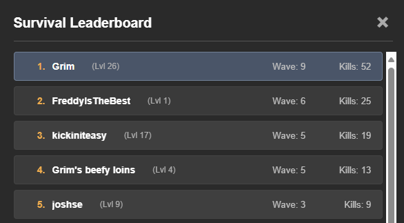 I also need to work on authentication so you can login and restore your progress even if you accidentally clear your browser's cache. That will likely involve clearing the current leaderboard, but I'm planning on reworking Survival Mode anyway, so that'll give me a good excuse to do so. Hopefully I can get all three – physics, new auth, and survival overhaul – finished this month!