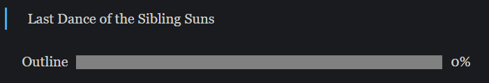 Now that To Burn All Belief is written, I have a really good idea of where each character's story is going, enough that I'm just about ready to start laying out parts of the outline. Like with Sibling Suns 2, I'll need to sit down and do some worldbuilding for several key aspects of the story (last time it was The Peeker Mounds and Paceeqi culture & religion). Once that's done, I can really get that progress bar moving.