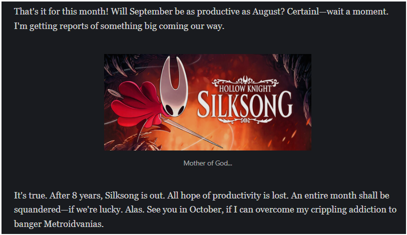 But lo, as soon as I finished Silksong, I came down with Covid yet again (my fourth or fifth time, I think). A lot of my writing time is on the train into work, so that left yet another void in my writing metrics spreadsheet. Not to worry though, I was in such a fog that writing while Covid-infested would have just made more work for me during the second draft. I'll be feeling better soon, and then I'll get right back into the story!