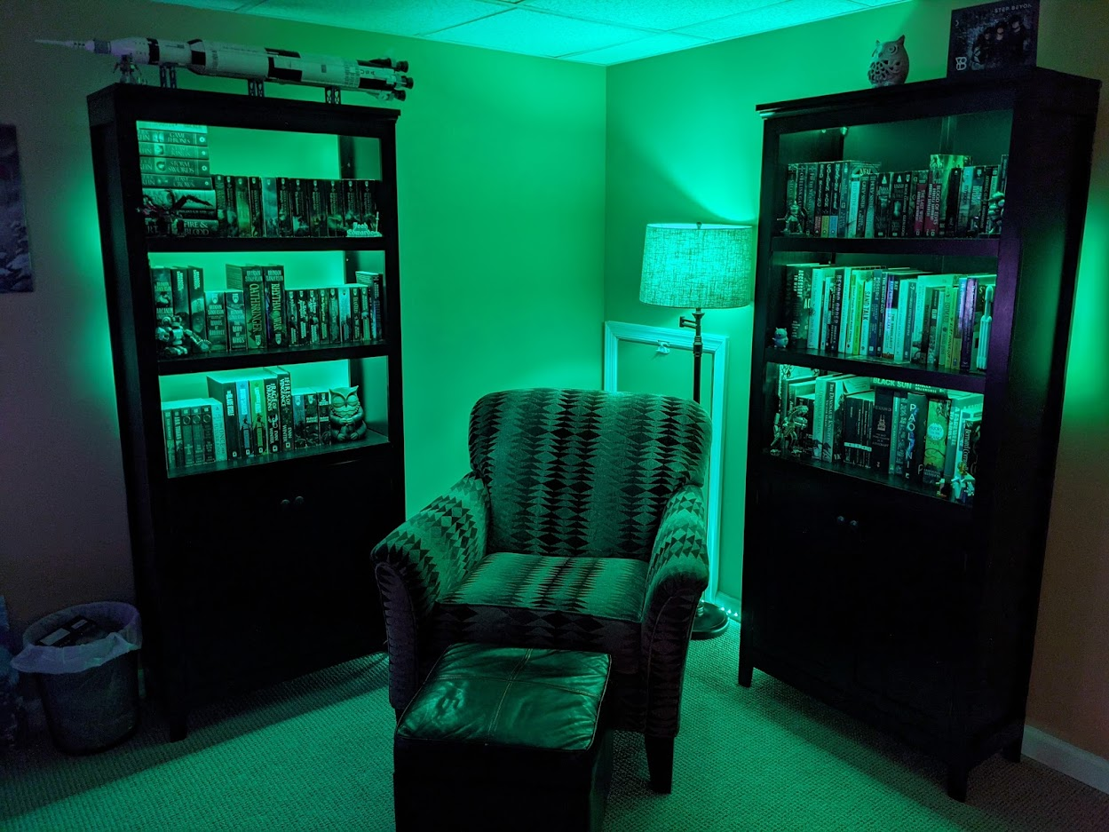 He struck me instantly as a professional, thanks largely to his lighting. So I replicated it. Since this office is going to be my more-or-less permanent base of operations for years to come, where I'll be meeting with editors, other writers, and who-knows-who-else via video call, I decided to splurge. As has quickly become Zoom tradition, I even have my bookshelves in the background, which I fitted with some hidden, remote-controlled LEDs.