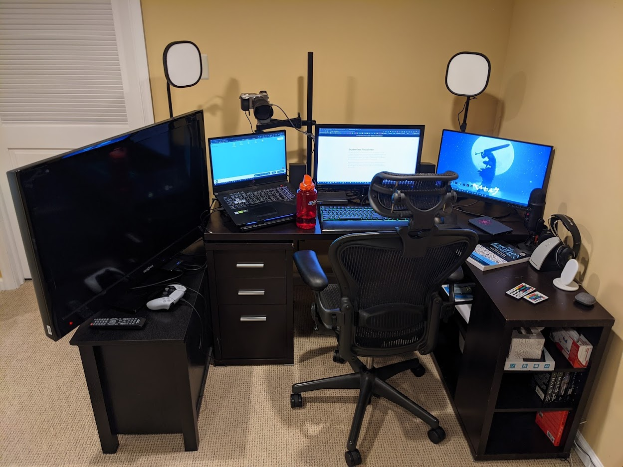 I'm particularly happy with how the camera setup turned out (though I can't say the same for the rat's nest of wires hidden behind the monitors). I've got a Sony α6000 with a Sigma 16mm f/1.4 lens hooked up to stream 60 fps video to my laptop. When I turn down the lights and flick on the diffuse lighting, the video quality is stunning. I just wanted a step up from my old Logitech C920 webcam. It ended up being far better than what I should have, to be honest.