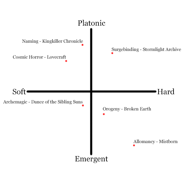 There's also this fascinating post on Platonic vs. emergent magic systems by author John Bierce, in which he explains why he presents an orthogonal scale of magic systems. Platonic magic is related to the ideal form of something. His example is fire magic, where a spell produces fire in reference to some pure, ideal form of fire. His example of emergent magic is also fire, but this time the spell just creates abrupt increases in temperature. The hard/soft continuum is about how much of the rules are presented to the reader; this new continuum more closely relates to the properties of the rules themselves.