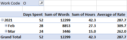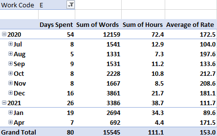There is a regrettable chunk of time missing from my metrics between May 6, 2020 and July 6, 2020, during which I was working on my second draft revision guide for An Ocean of Others. Until February 1, 2021 I only ever tracked time spent writing and editing. Later, I added categories as they were needed, including outlining, working on blog posts, reading (not just any book, but my own and writing groups' work), and working on the business side of things.